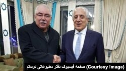 عبدالرشید دوستم، معاون اول ریاست جمهوری افغانستان و زلمی خلیلزاد، نمایندۀ ویژۀ امریکا برای صلح افغانستان شام روز چهارشنبه در شهر انقرۀ در مورد پروسه صلح گفتگو کرده اند.