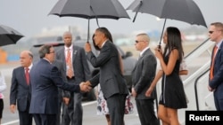 در میدان هوایی، رئیس جمهور اوباما، همسرش و دو دخترش با استقبال هیات کیوبایی همراه شد.
