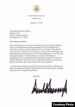 آقای ترمپ با نشر نامه ای به خانم پلوسی نگاشته است که به خاطر تعطیلی قسمی حکومت فدرال "این سیر و سفر هفت روزه" را در یک زمان دیگر برنامه ریزی خواهند کرد.