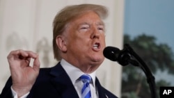 آقای ترمپ سه شنبه (۸ می ۲۰۱۸) در سخنرانی از قصر سفید بار دیگر توافق هستهای ایران را "فاجعه بار" خواند و گفت که این معامله صلح و آرامش را به همراه نیاورده و نخواهد آورد. او رژیم ایران را "تروریست پرور" خواند و تاکید کرد که اجازه نخواهد داد رژیمی که شعار "مرگ بر امریکا" سر میدهد به اسلحۀ هستهای دست یابد.