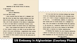 من نامه ای را که در آن اعلیحضرت شما مرا از مرگ پدر تان، اعلیحضرت امیر حبیب الله خان، و جلوس شما بر تخت افغانستان، و نیز از تمایل شما به تحکیم روابط دوستانۀ دیپلوماتیک میان ایالات متحده و افغانستان مستحضر ساخته اید، از دست جنرال محمد ولی خان دریافت کردم.