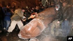 معترضان ضد حکومتی در یوکراین مجسمه ولادمیر لینن، بانی اتحاد شوری سابق را در کیف در جریان اعتراضات عمومی که برضد وکتور یانکوویچ براه انداخته اند، سرنگون کردند.
