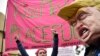مظاهره کنندگان شعار های کنایه آمیز برگرفته شده از اظهارات دونالد ترمپ رئیس جمهور ایالات متحده را حمل میکنند که او آنرا در جریان مبارزات انتخاباتی اش بیان کرده بود.